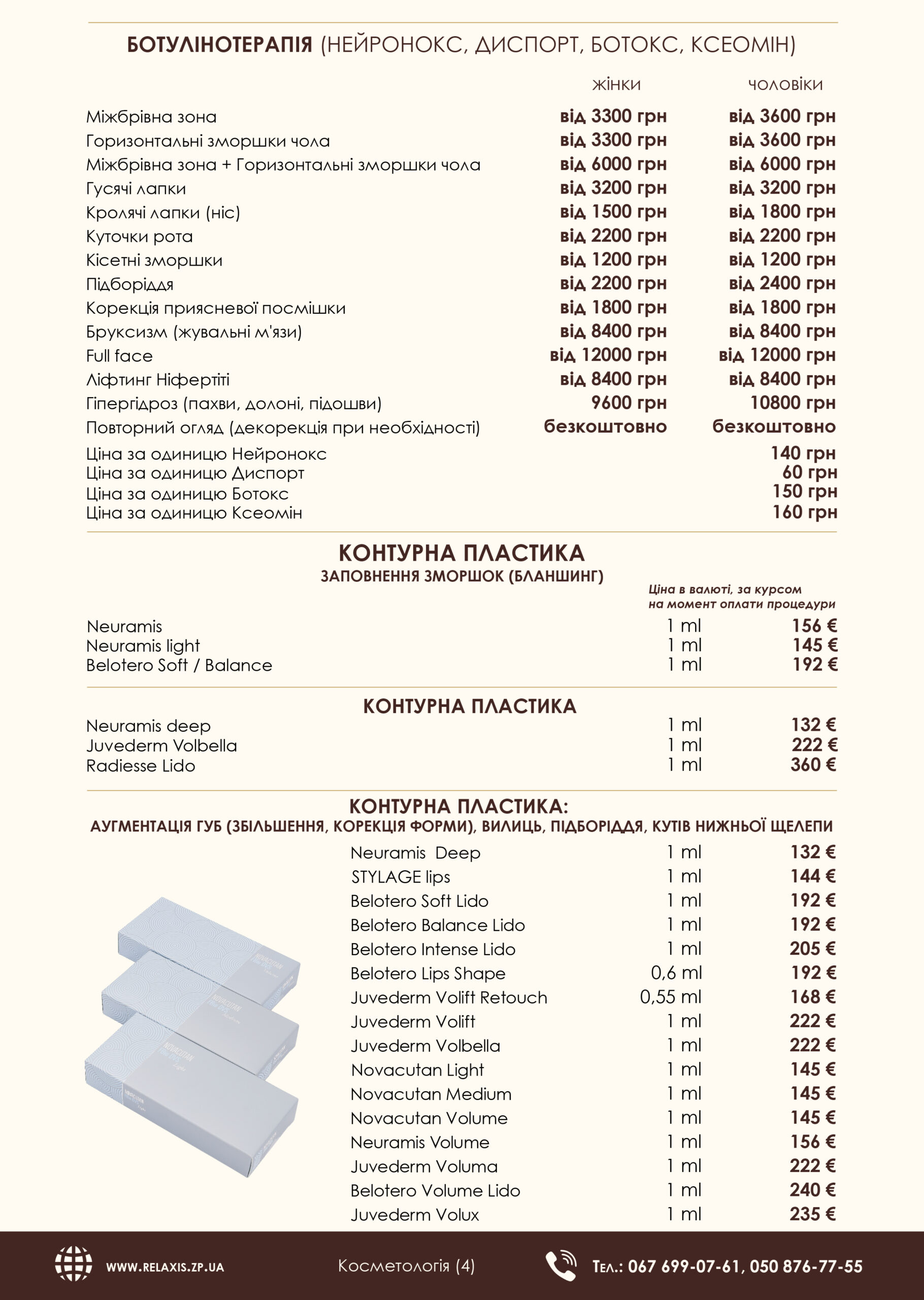 Косметологи студии RELAXIS проводят процедуры биоревитализации, мезотерапии, ботулинотерапии и контурной пластики только высококачественными и сертифицированными препаратами.